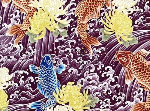 激流の瀧を昇る鯉に菊花が寄り添う雅柄